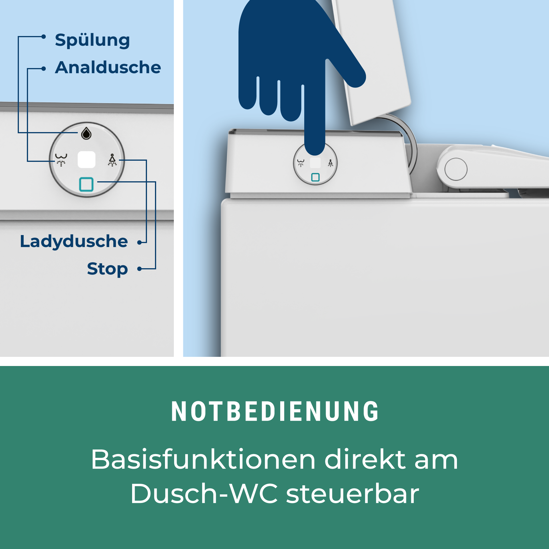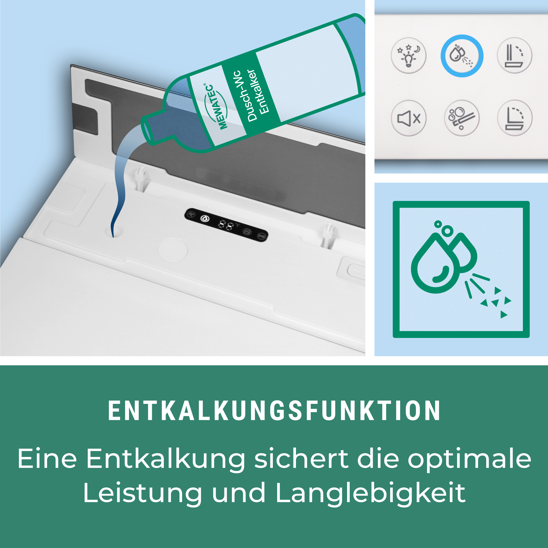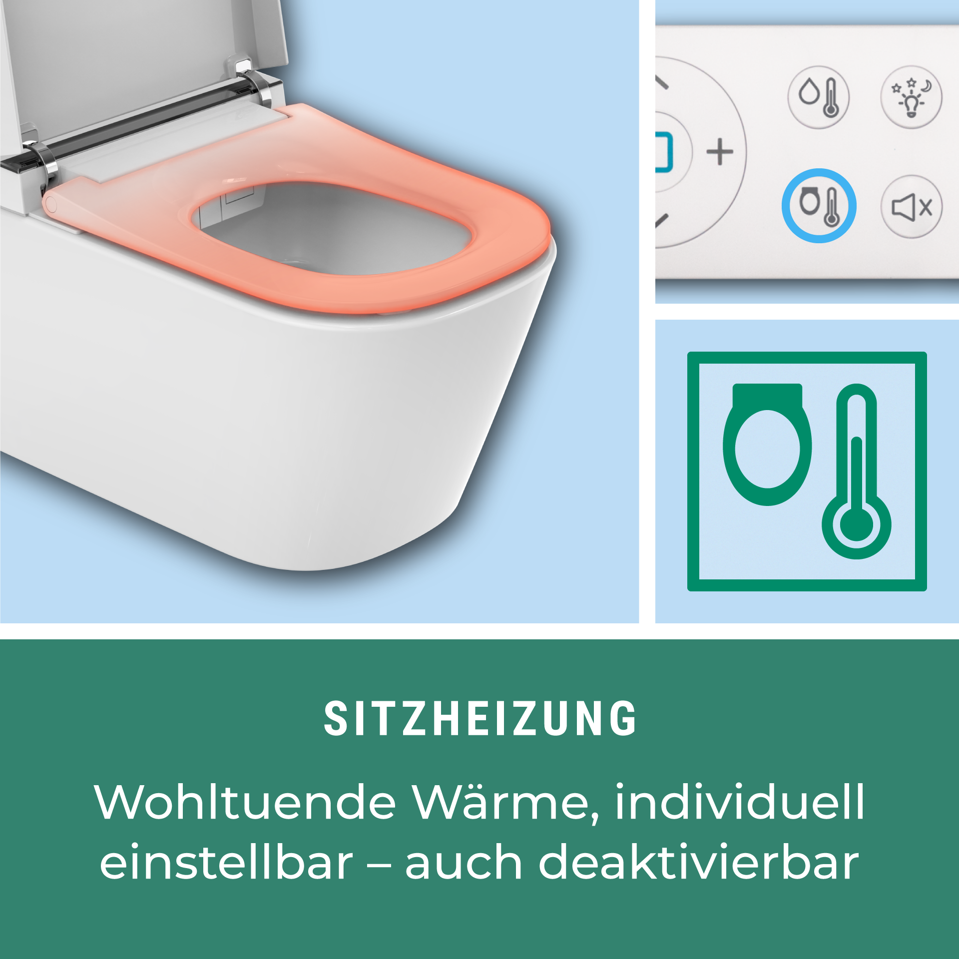 Funktionen Dusch-WC : NEU Sitzheizung • Gesäß- und Ladydusche • Duscharmposition/ Duschstrahlstärke/ Wassertemperatur einstellbar • Sprudeldusche extra AIR+ • automatische Düsenreinigung  • oszillierende Dusche • Warmluftföhn  • Geruchsabsaugung • Nachtlicht