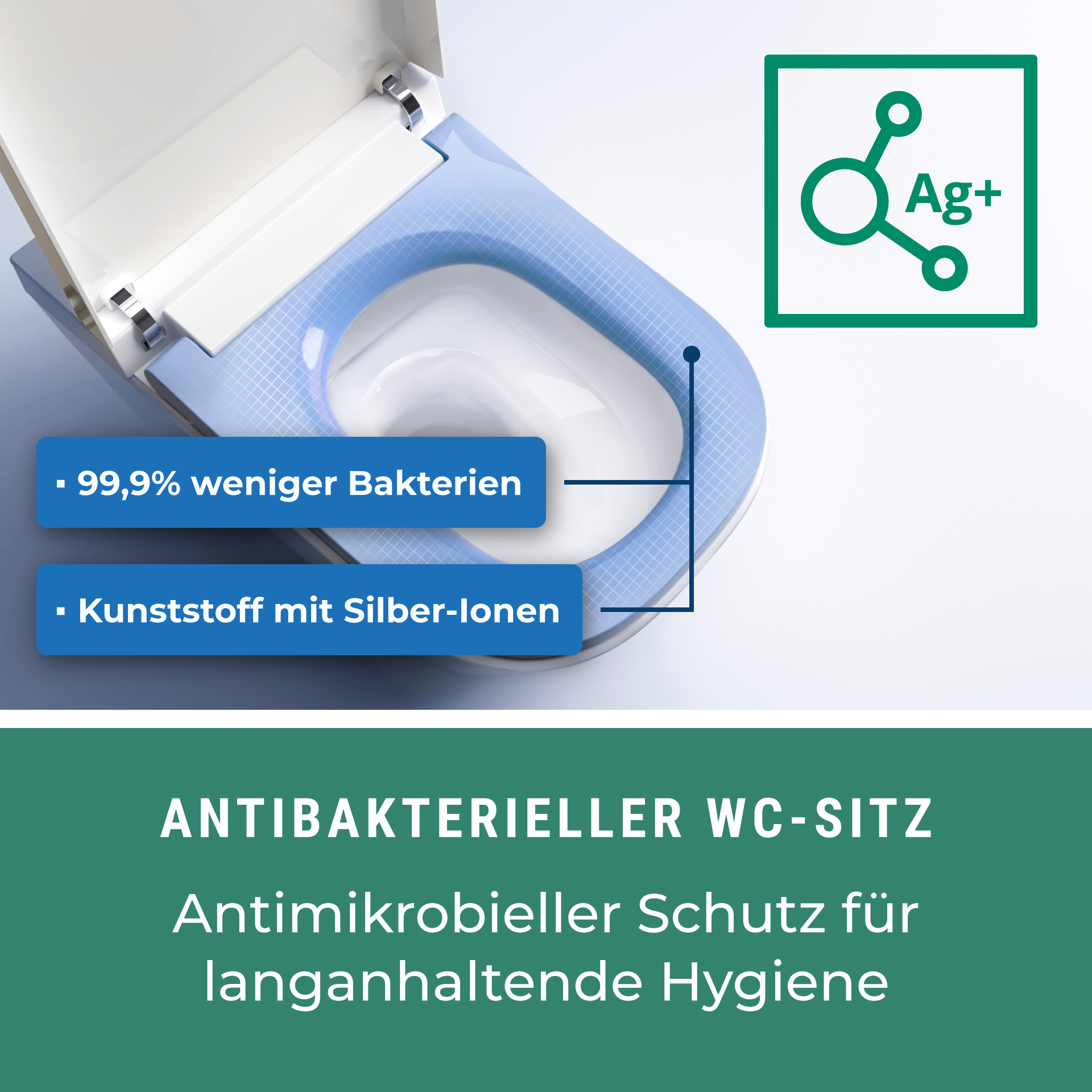 Ausstattung Dusch-WC : DVGW konform (EN1717) • edle Glasfront mit LED Anzeige der Einstellungen •  großer Sitzausschnitt • Absenkautomatik • antibakterieller Kunststoff mit Silber Ionen Technology AG++ • LED Fernbedienung