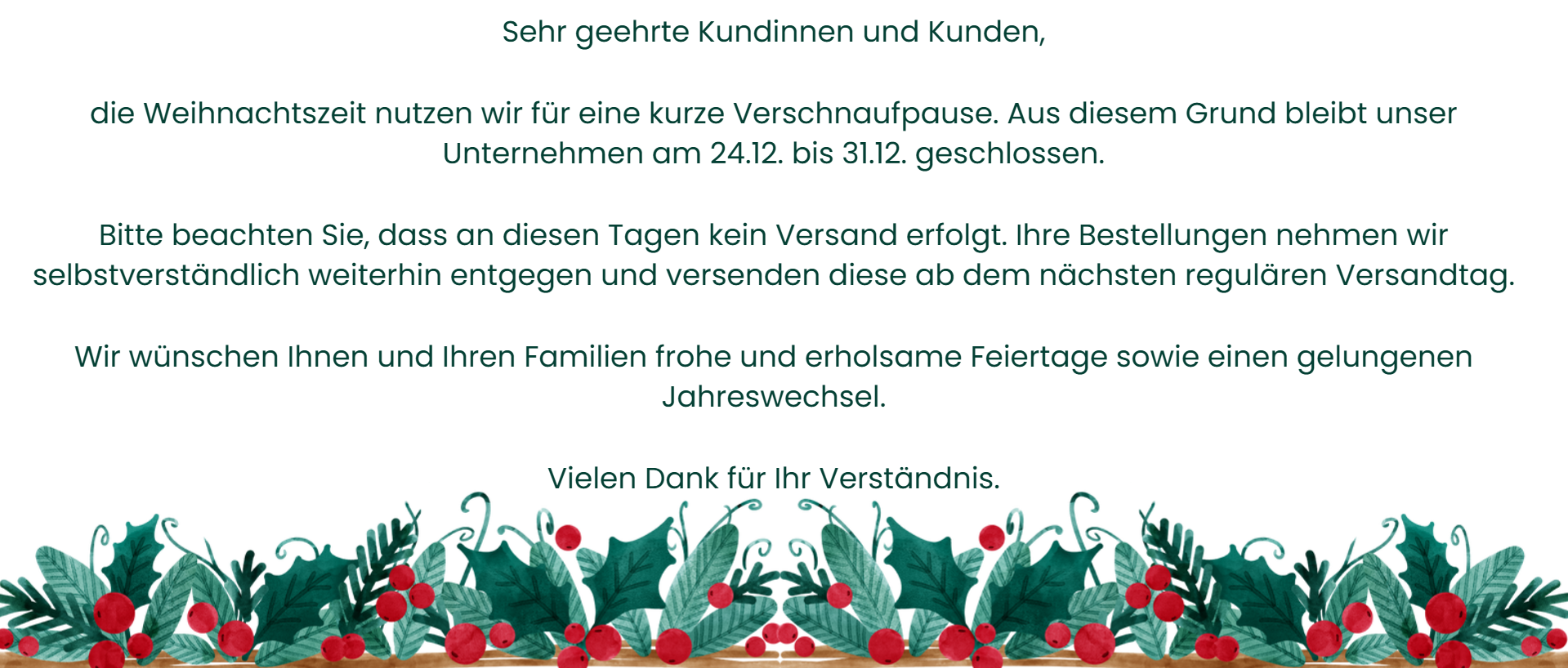 Bitte beachten Sie, dass an diesen Tagen kein Versand erfolgt. Ihre Bestellungen nehmen wir selbstverständlich weiterhin entgegen und versenden diese ab dem nächsten regulären Versandtag.